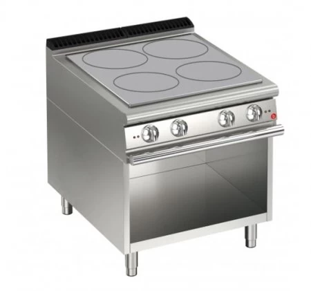 verfügen über 4 Heizzonen mit je einer Heizung. Die Kochplatte ist unverformbar und eignet sich auch für das direkte Kochen. Eine umlaufende Fettauffangrinne mit Ablaufloch sorgt für sauberes Arbeiten. Die Modelle mit Elektrobackofen verfügen über Heizkörper aus Edelstahl an der Oberseite und unter dem Boden der Backkammer. Die abnehmbare Frontblende sorgt für servicefreundlichen Zugriff, die geschwungene Form sowie die ergonomisch schräggestellten Knebel reduzieren Schmutzablagerungen.