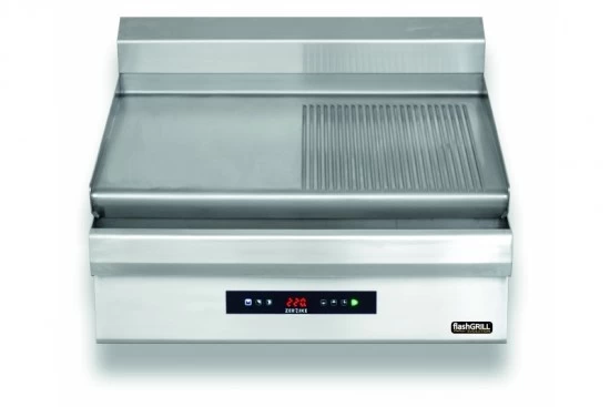 Dank seines patentierten indirekten Heizsystems der Wärmeübertragung lässt sich der Grill auf 1°C genau einstellen und betreiben. Die Heizungen liegen in einer abgedichteten Kammer in einem diathermischen Ölbad und verteilen so gleichmäßig und konstant die erzeugte und gespeicherte Wärme auf der gesamten Bratfläche, was zu einer enormen Energieeinsparung führt. Dies ermöglicht dem Anwender das Garen bei niedriger Temperatur (210-240°C). Dadurch wird der Rauchpunkt von gesättigten Fetten nicht erreicht und die Bildung von Amine und Carbonsäuren vermieden. Da das Ölbad als thermische Reserve fungiert und die Wärme nur langsam abgegeben wird, hat der FlashGRILL einen sehr geringen Anschlusswert und Stromverbrauch! Die besondere Stahllegierung der Bratfläche ist formbeständig, verschleißt nicht und erlaubt das Schneiden der Gerichte direkt auf der Bratfläche.