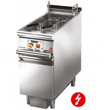 ist für höchste Anforderungen entwickelt. Dank des 7“ TouchScreen-Display ist eine einfache und intuitive Auswahl der Frittierprogramme möglich. Der Anwender hat dieWahl zwischen voreingestellten und erprobten Rezepten und kann wahlweise eigene Rezepte speichern! Zusätzlich steht eine Ausführung mit automatischen Ölfiltrationssystem zur Verfügung. Diese pumpt das verschmutzte Öl ab, filtert es und pumpt das filtrierte Öl zurück in das Becken. Des Weiteren gibt es auch eine Ausführung mit automatischem Korbliftsystem. Nach Ablauf des eingestellten Programms wird der Korb aus dem Öl gehoben und es ertönt ein Signal. Die Version EVO-Touch GFL verfügt sowohl über das automatische Filtrationssystem als auch das automatische Korbliftsystem. Die Geräte der Serie 900Q sind IPX5 Strahlwassergeschützt produziert