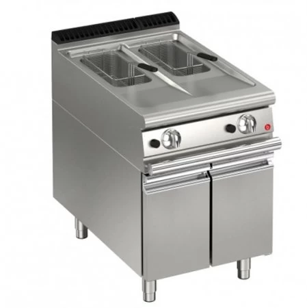 eignen sich zum Fritieren großer Mengen. Durch die großzügige „Kaltzone“ sorgt die Friteuse für Energie- und Ölersparnis sowie Zeitersparnis bei der Reinigung. Die Deckplatte ist aus einer dicken Edelstahlplatte gepresst, die Fackelbrenner befinden sich außerhalb der Wanne und werden mittels Funkenzündung gezündet. Die abnehmbare Frontblende sorgt für servicefreundlichen Zugriff, die geschwungene Form sowie die ergonomisch schräggestellten Knebel reduzieren Schmutzablagerungen.