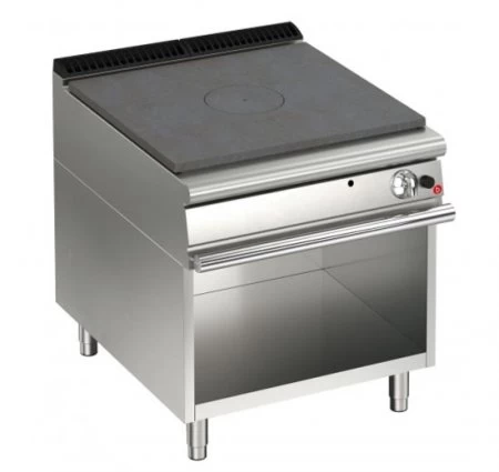 verfügen über einen zentralen hochleistungsfähigen Brenner. Im Zentrum (mit abnehmbarer Mittelscheibe) erreicht der Anwender Temperaturen bis 500°C. Die Temperatur nimmt nach außen hin ab, wodurch sich diese Bereiche ideal zum langsamen Garen und Warmhalten von Speisen eignen. Die Gasmodelle bestehen aus einer geschliffenen Gusseisenplatte mit Gasbrenner mit Piezozündung. Die abnehmbare Frontblende sorgt für servicefreundlichen Zugriff, die geschwungene Form sowie die ergonomisch schräggestellten Knebel reduzieren Schmutzablagerungen.