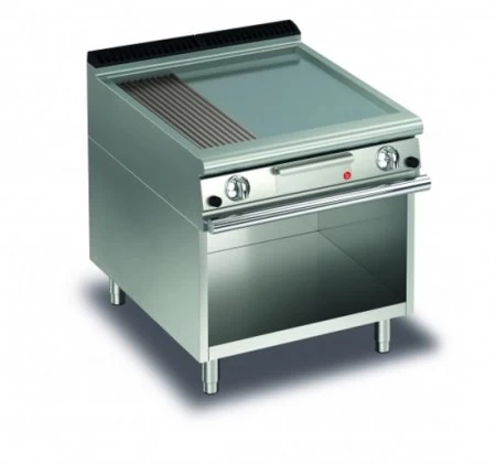 eignen sich zum Braten großer Mengen bei gleichmäßiger Temperatur. Die Gasmodelle sind mit Gasbrenner mit Piezozündung ausgestattet und regeln von 200 °C bis 400 °C. Die hartverchromten Modelle sind mit einem Thermostatventil zur Regelung der Temperatur im Bereich 100 °C bis 280 °C ausgestattet. Die abnehmbare Frontblende sorgt für servicefreundlichen Zugriff, die geschwungene Form sowie die ergonomisch schräggestellten Knebel reduzieren Schmutzablagerungen.