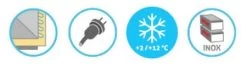 Steckerfertige Umluftkühlung mit unverwüstlich komplett in der Rückwand eingeschäumtem Verdampfer, automatischer Abtauung und Tauwasserverdunstung. Elektronische Regelung mit Digitalanzeige und beleuchtetem EIN-/AUS-Schalter. Geteilte Maschinenfachblende ohne Werkzeug zur Kondensatorreinigung demontierbar. Schubladen mit Teleskopauszüge aus Edelstahl, Nutzhöhe je 170 mm. Schubladenschilder jeweils in einem Stück hochdruckgeschäumt, mit integrierter Griffleiste und leicht auswechselbarer Magnet-Dichtung. Mit 4 Ausgleichsfüßen. Sockelbaufähig. Tischplatte nicht abnehmbar.