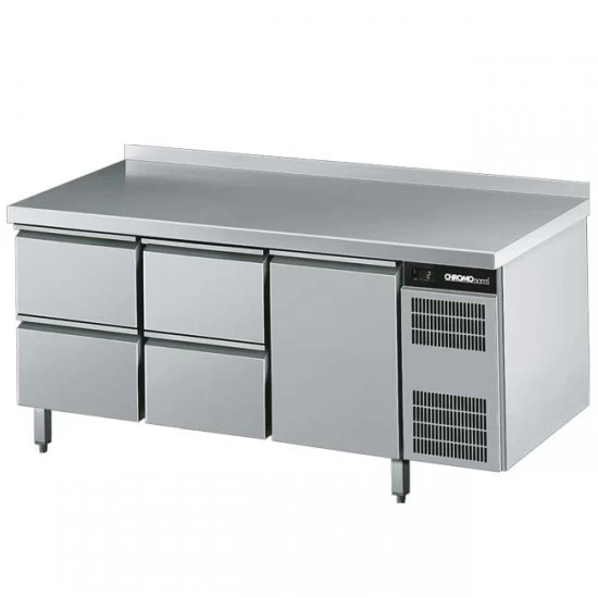 Steckerfertige Umluftkühlung mit spezialbeschichtetem Deckenverdampfer, automatischer Abtauung, Tauwasserverdunstung und elektronischer Regelung mit Digitalanzeige. Kältemaschine für Servicezwecke beweglich montiert. Maschinenfachblende zur einfachen Kondensatorreinigung ohne Werkzeug demontierbar. Flügeltüren und Schubladenschilder jeweils in einem Stück hochdruckgeschäumt, mit integrierter Griffleiste und leicht auswechselbarer Magnet-Dichtung. Schubladen mit Teleskopauszüge aus Edelstahl, Nutzhöhe je 208 mm. Füße 150 mm hoch, höhenverstellbar +/- 20 mm. 2 kippsichere höhenverstellbare U-Auflageschienenpaare und 2 Tragroste GN 1/1 aus CNS 18/10 als Zubehör. Sockelbaufähig. Tischplatte abnehmbar.