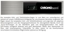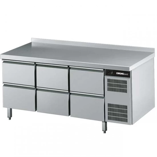 Steckerfertige Umluftkühlung mit spezialbeschichtetem Deckenverdampfer, automatischer Abtauung, Tauwasserverdunstung und elektronischer Regelung mit Digitalanzeige. Kältemaschine für Servicezwecke beweglich montiert. Maschinenfachblende zur einfachen Kondensatorreinigung ohne Werkzeug demontierbar. Schubladenschilder jeweils in einem Stück hochdruckgeschäumt, mit integrierter Griffleiste und leicht auswechselbarer Magnet-Dichtung. Schubladen mit Teleskopauszüge aus Edelstahl, Nutzhöhe links und mittig je 208 mm – rechts 160 / 208 mm. Füße 150 mm hoch, höhenverstellbar +/- 20 mm. Sockelbaufähig. Tischplatte abnehmbar.