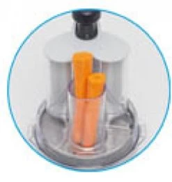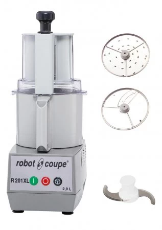 | Motorblock: Kutteraufsatz: Gemüseschneideaufsatz: Schneidscheiben: | Asynchronmotor 2,9-Liter Kutterschüssel aus Edelstahl mit Handgriff und tief liegendem glattem Messer, Impulsschalter 1 halbkreisförmige Einfüllöffnung (Querschnittsfläche 87 cm2) 1 zylinderförmige Einfüllöffnung (Ø 58 mm), 2 (1 Schneidscheibe 2mm, 1 Reibescheibe 2mm) | |