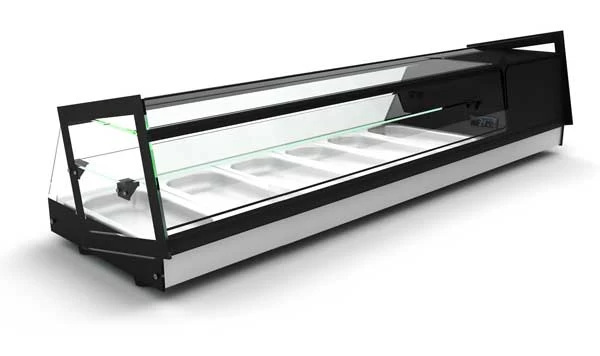 - 3 Ebenen (gekühlte GN-Behälter, innere Glasablage, Top-Ablage)