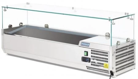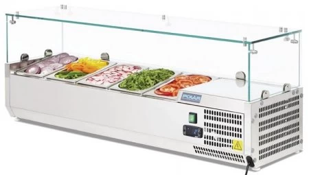 | Polar Aufsatzkühlvitrine 5 x GN1/4 Aufsatzkühlvitrine, in 4 Größen erhältlich. Geeignet für GN 1/4-Behälter mit einer Tiefe von bis 100 mm. GN-Behälter werden nicht mitgeliefert. Edelstahl-Konstruktion mit Sicherheitsglas. Einfach zu bedienen durch digitales Display. Die Aufsatzkühlvitrine dient unter anderem als Salat- und Delikatessenbar. |