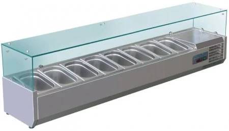 | Breite: Höhe: Tiefe: Material: Spannung: Temperatur: Kältemittel: | 180 cm 43,5 cm 33 cm Edelstahl 230 V / 150 W +2° bis +8°C R600a | Geeignet für: Umgebungstemperatur: Gewicht: Stecker: Ausstattung: | 8 x 1/4 GN Behälter max. 32°C 65 kg ja, im Lieferumfang digitales Display, Sicherheitsglas |