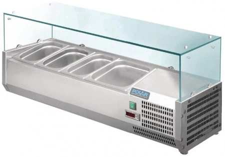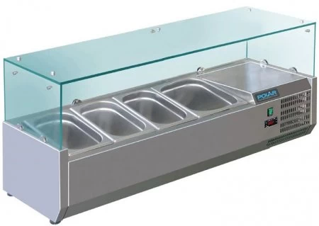| Polar Aufsatzkühlvitrine für 3x GN1/3 + 1x GN1/2 In diese Aufsatzkühlvitrine passen 4 Gastronormbehälter (3x GN1/3 und 1x GN1/2, separat erhältlich), in denen Sie Zutaten hygienisch und gekühlt aufbewahren können. Die perfekte Wahl für kleinere Sandwichläden, Pizzerias und Restaurants. Dank der genauen digitalen Bedienung und der starken Edelstahlkonstruktion ist diese Vitrine äußerst benutzerfreundlich und einfach zu reinigen und zu warten. Weiterhin sorgt die kraftvolle Kühlung dafür, dass Ihre Zutaten stets optimal gekühlt bleiben, selbst wenn die Umgebungstemperatur höher ist. So ist diese Aufsatzkühlvitrine ideal für warme Sommer und Küchen, in denen die Temperatur schnell steigt. |
