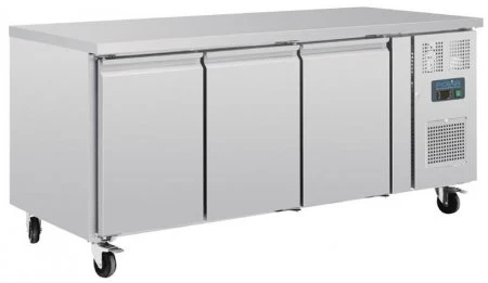 | Polar Bäckereikühltheke dreitürig Professionelle Thekenkühlung, die auch zusätzliche Arbeitsfläche bietet. Semi-automatisches Abtauen in Zeitintervallen mit konstanter Digitalanzeige. Geliefert mit feststellbaren Rädern für einfache Manövrierbarkeit. Für Patisserieroste (600x400mm) geeignet (max. 7 Stück pro Tür).