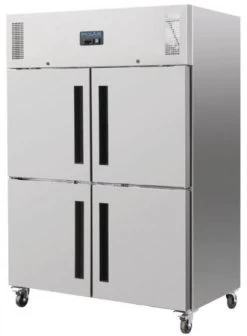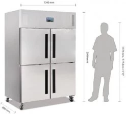 | Idealer kommerzieller Kühlschrank mit 50/50 geteilten Türen. Mit abschließbaren Türen bei denen Sie nur den Teil öffnen, den Sie brauchen. So behält der Schrank die Temperatur effizienter als mit ganzen Türen. Für den leichten bis mittleren Gebrauch in gewerblichen Küchen. Der Kühlschrank ist geeignet für 10 GN2/1 10cm tiefe Behälter. Mit vollautomatischer Steuerung und digitaler Anzeige, semi-automatischer Abtauung in Zeitintervallen und feststellbaren Rollen. |