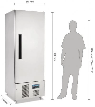 | Nutzinhalt: Breite: Höhe: Tiefe: Material: Spannung: Temperatur: Kältemittel: Steuerung: | 313 Liter 68,5 cm 195 cm 71 cm außen Edelstahl, innen Aluminium 230 V / 250W -2° bis +8°C R600a Vollautomatisch, Digital | Umgebungstemperatur: Gewicht: Kühlung: Stecker: Fahrbar: | bis max. 32°C 113 kg Umluft ja, im Lieferumfang ja, Rollen |