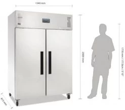 | Nutzinhalt: Breite: Höhe: Tiefe: Material: Spannung: Temperatur: Kältemittel: Steuerung: | 770 Liter 134 cm 200 cm 81,5 cm Edelstahl 230 V / 700W / 3,3A -2° bis +5°C R290 Vollautomatisch, Digital | Umgebungstemperatur: Gewicht: Kühlung: Stecker: Fahrbar: | max. 32°C 180 kg Umluft ja, im Lieferumfang ja, Rollen |