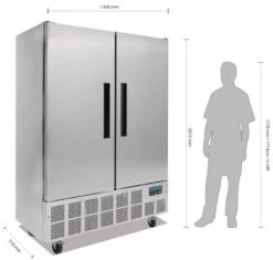 | Nutzinhalt: Breite: Höhe: Tiefe: Material: Spannung: Temperatur: Kältemittel: Steuerung: | 671 Liter 134 cm 200 cm 71 cm Edelstahl 230 V / 800W -2° bis +5°C R290 Vollautomatisch, Digital | Umgebungstemperatur: Gewicht: Kühlung: Stecker: Fahrbar: | bis max. 32°C 165 kg Umluft ja, im Lieferumfang ja, Rollen |