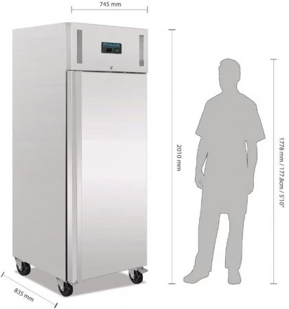 | Heavy-duty Kühlung von Polar mit einer Kapazität von 650 Liter und 70 mm energiesparender Isolierung. Zwangsbelüftung sorgt für eine konstante, gleichmäßige Temperatur für die optimale Konservierung von Lebensmitteln, während die automatische elektrische Abtauung (mittels eines Heizelements) eine einfache Wartung garantiert. Verschließbare, selbstschließende Türe hält den Kühlschrank kühl und Lenkrollen machen ihn leicht zu manövrieren. Bitte beachten Sie: Die Umgegungstemperatur darf 40°C nicht überschreiten. |