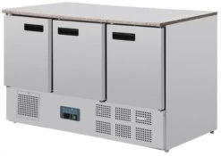 | Polar Thekenkühltisch mit Marmorarbeitsfläche 3türig 368Ltr Thekenkühltisch mit Marmorarbeitsfläche geeignet für 1/1GN-Behälter. Platzsparender Kompressor im unteren Teil. Ausgestattet mit vollautomatischer Steuerung und konstanter Digitalanzeige. |