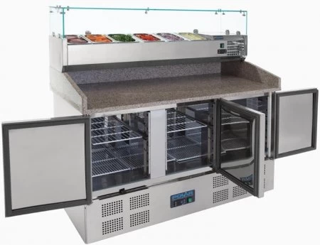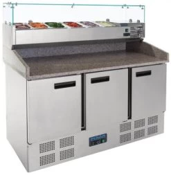 | Polar Thekenkühltisch für Pizzen und Salate 368L Für die Zubereitung von Pizza, Salate, Wraps oder Sandwiches bietet der Polar Thekenkühltisch die ideale, zuverlässige Kühlstation. Dank ihrer großen Kapazität können Sie große Mengen gekühlte Lebensmittel Lagern hinter den drei Edelstahltüren, während die robuste Servertheke oben schnellen Zugang zu oft gebrauchten Zutaten verschafft. Die beständige Marmorplatte ist ideal für die Zubereitung von Pizzen, da die kühle Oberfläche perfekt ist um Teig zu kneten. |