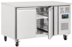 | Polar Kühltisch 228 Liter 2-türig Edelstahl-Arbeitstische mit Kühlschrank oder Gefrierer. GN1/1- Interieur. Edelstahl innen und außen. 2 selbstschließende Türen. Kühlwände und Türen 50 mm dick isoliert. 4 Räder (vordere feststellbar). Einfach zu bedienen durch digitales Display. |