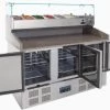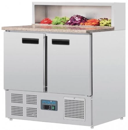 | Polar Pizzakühltisch 2-türig 288L Pizza- oder Sandwich-Tisch mit Marmor-Arbeitsplatte. Mit Kühlaufsatz, geeignet für 5x GN1/6 Behälter bis 150mm. Lieferung exklusive GN-Behälter. 2-türig, hinter jeder Tür 1 GN1/1-Kühlfach (4 x GN 1/1). Edelstahl innen und außen. Semi-automatisches Abtauen in Zeitintervallen. Selbstschließende Türen. Temperatur einfach durch digitales Display einstellbar von +2°C bis +8°C. |