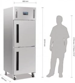 | Idealer kommerzieller Gefrierschrank mit 50/50 geteilter Tür. Mit abschließbaren Türen bei denen Sie nur den Teil öffnen, den Sie brauchen. So behält der Schrank die Temperatur effizienter als mit ganzen Türen. Für den leichten bis mittleren Gebrauch in gewerblichen Küchen. Der Gefrierschrank ist geeignet für 10 GN2/1 10cm tiefe Behälter. Mit vollautomatischer Steuerung und digitaler Anzeige, semi-automatischer Abtauung in Zeitintervallen und feststellbaren Rollen. |