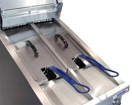 - Roband Fritteusen verfügen über Heizelemente, die sich in Sekundenschnelle nach oben schwenken lassen. Sie bieten Zugang zu einem glatten und offenen Behälter für eine einfache Reinigung. Es gibt keine Gasleitungen, um die herumgeputzt werden muss und auch keine Spalten, die schwer erreichbar sind um gründlich gereinigt werden zu können, wie es bei Gasfritteusen der Fall ist.