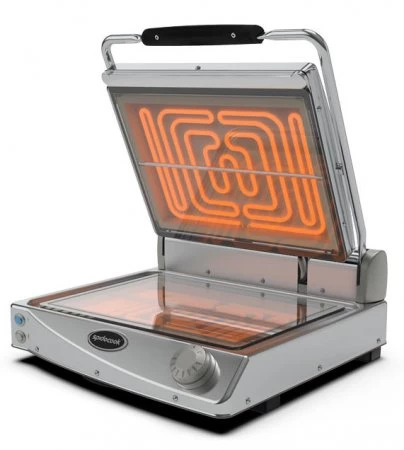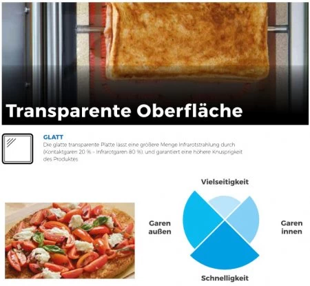 Professionelle Systeme zum Kontaktgaren mit Platten aus Glaskeramik, geeignet zum Garen von einer breiten Palette an verschiedenen Speisen wie: Toasts, belegte Brötchen, Fleisch, Fisch Gemüse, Eier, usw.