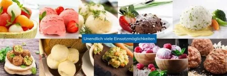 Die Portionierer werden auch für genaues Portionieren und Anrichten immer gleicher Portionen eingesetzt. Egal ob Burger Patty, Kuchenteig, Mousse, Reis, Butter, Falafel, Hackfleisch oder Praline, es werden immer gleiche Mengen portioniert. Präzises Kalkulieren von Preis und Menge ist möglich.
